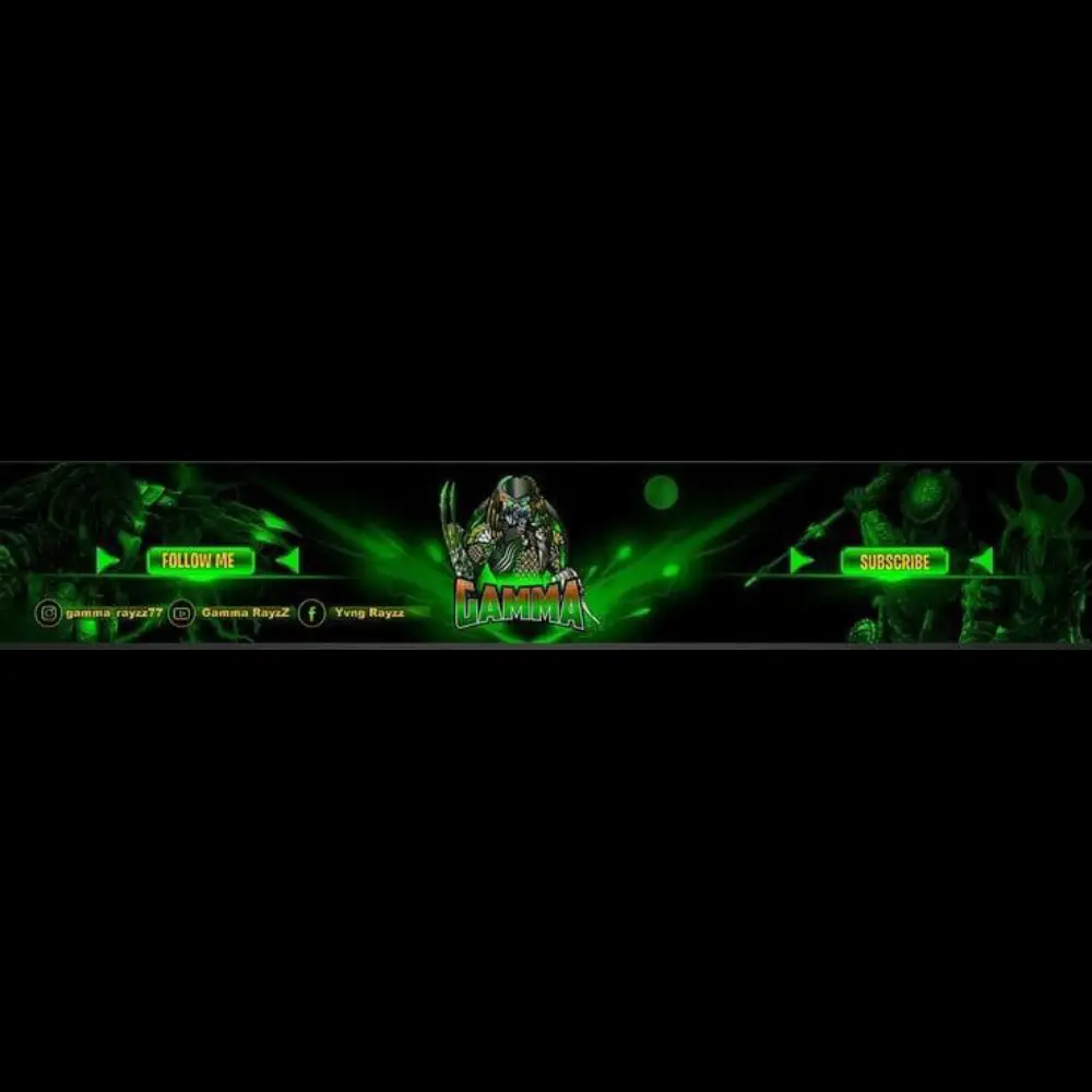 This custom gaming YouTube banner features a green-and-black Predator-inspired theme, perfect for channels like Gamma Rayzz. The design includes social media links and bold calls-to-action like “FOLLOW ME” and “SUBSCRIBE”, giving your channel a professional, sci-fi gaming aesthetic.