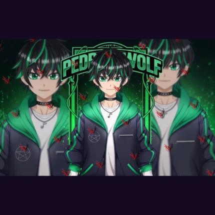 This digital artwork features an original anime-style character associated with VISUAL VOXX / VIGO. The character is a black-haired boy with one glowing green eye, set against a background showcasing the VISUAL VOXX logo. Perfect for VTuber branding, online content creation, avatars, and digital art projects, this high-quality illustration highlights a unique and striking original character design.