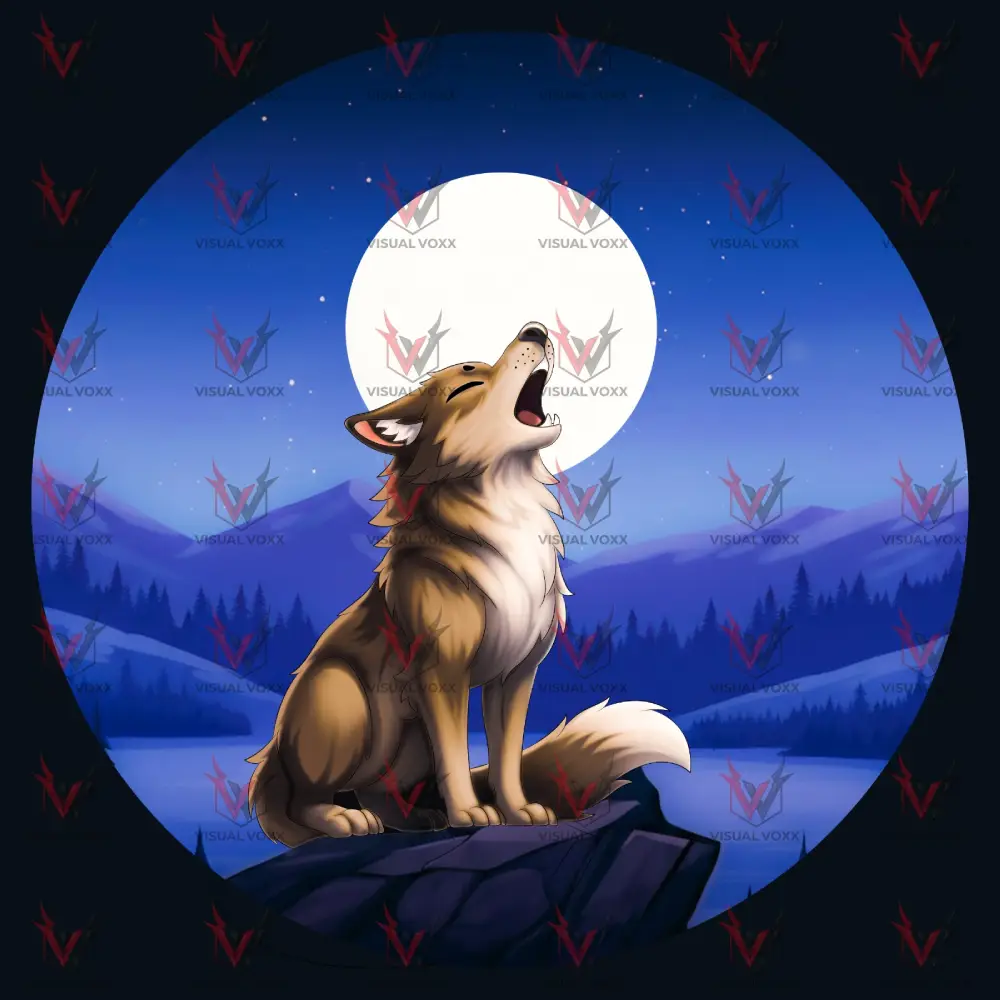 This digital art print features a lone wolf howling at a full moon in a serene forest landscape. With a blue and purple night sky, mountains, and water reflections, this artwork captures a mystical, atmospheric vibe. Perfect for wall art, posters, or digital collections, and branded with VISUAL VOXX for authenticity.